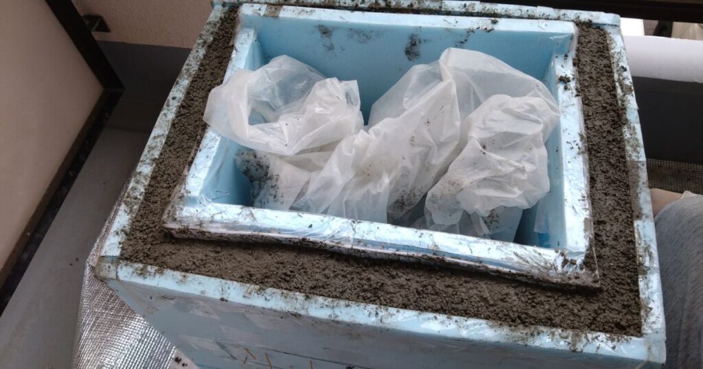 いよいよ、セメントとパーライトと水を混ぜて型に流し込む作業に突入。
